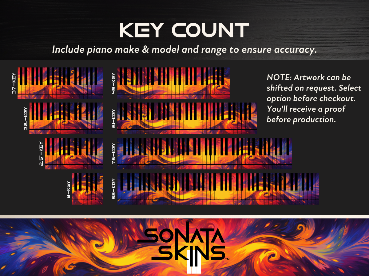 SonataSkins have been thoroughly tested on pianos and keyboards with plastic keys only. As of yet, we do not recommend use on wood, ivory, or antique piano keys until further testing is completed, as removal without care from these surfaces may risk damage. The consumer accepts full responsibility for any potential damages caused to their instrument through application or removal. SonataSkins are not intended as a toy. While our materials have been safely used for years with no transfer of inks, adhesives, or chemicals under normal or heavy use, users may come into contact with adhesive during application or removal. We recommend washing hands with soap and water afterward to avoid possible skin sensitivity. SonataSkins are single-use only due to stretching when removed. Full realized lifespan may vary based on environment, playing style, and handling.